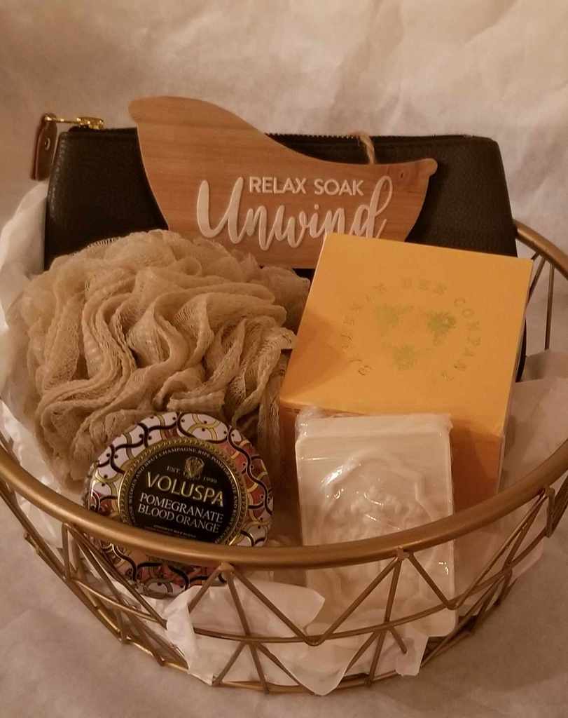 Lovely Gift Basket filled with items to help you relax and unwind. This basket includes a scented candle, mesh loofah, scented bar of soap, Savannah Bee Company cream and a faux leather brown makeup pouch.