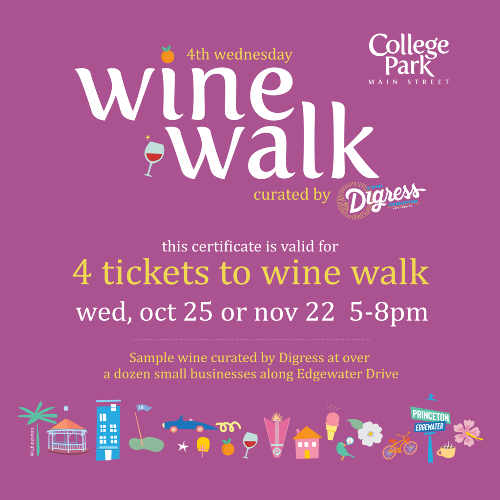4th Wednesday Wine Walk has been successful in bringing hundreds of new patrons to College Park and has raised thousands of dollars for its businesses. This item can be used at the 4th Wednesday Wine Walk on October 25 or November 22. Bring your friends to one of College Park's most fun events.