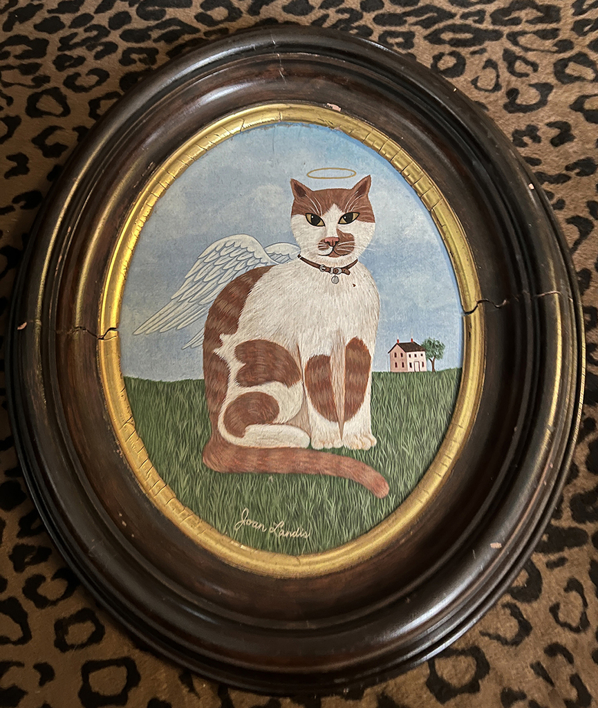 Original folk art style painting of a guardian angel kitty, signed by famed illustrator/painter Joan Landis; acrylic on board in heavy antique wood frame with gold trim.