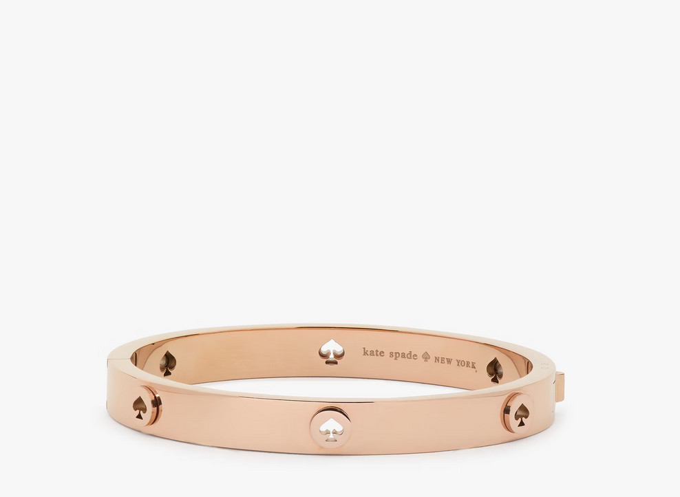 Bid on this fun statement bangle featuring a stainless steel rose gold, polished finish and the Kate Spade logo. Bangles are always in style, go ahead and show your style!