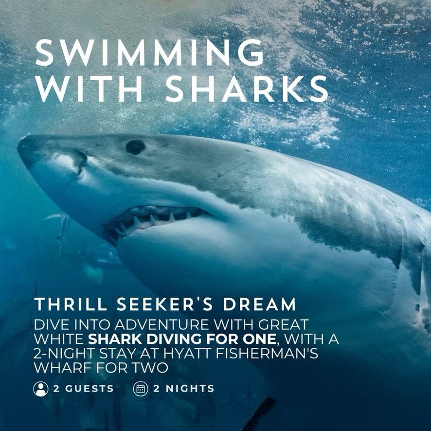 White Shark Diving for (1) with a 2-night Stay at Hyatt Fishermans Wharf for (2). This is the adventure of a lifetime, a chance to get up close and personal with these majestic creatures of the deep. No diving certification is required to participate, just a hint of courage.