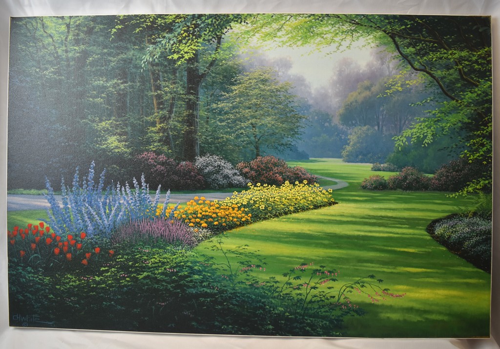 A beautiful and colorful piece, Afternoon in the Park, is the first in a series of Sunlit Summer Parks that takes you to a special place where time merely seems to stand still, and where lazy afternoons can be spent wandering down a pathway or just relaxing in a sunny spot on the lawn.