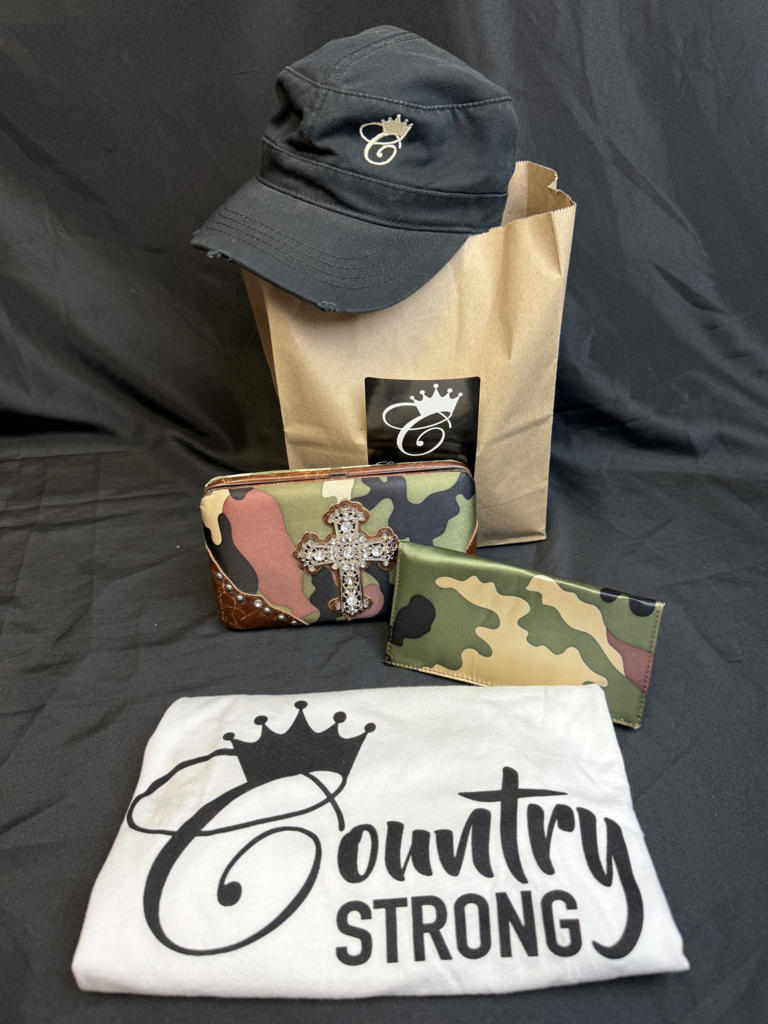 Camo snap closure clutch Wallet with matching checkbook sleeve, Camo Queen Logo Hat and Camo Queen Country Strong T-Shirt (S)