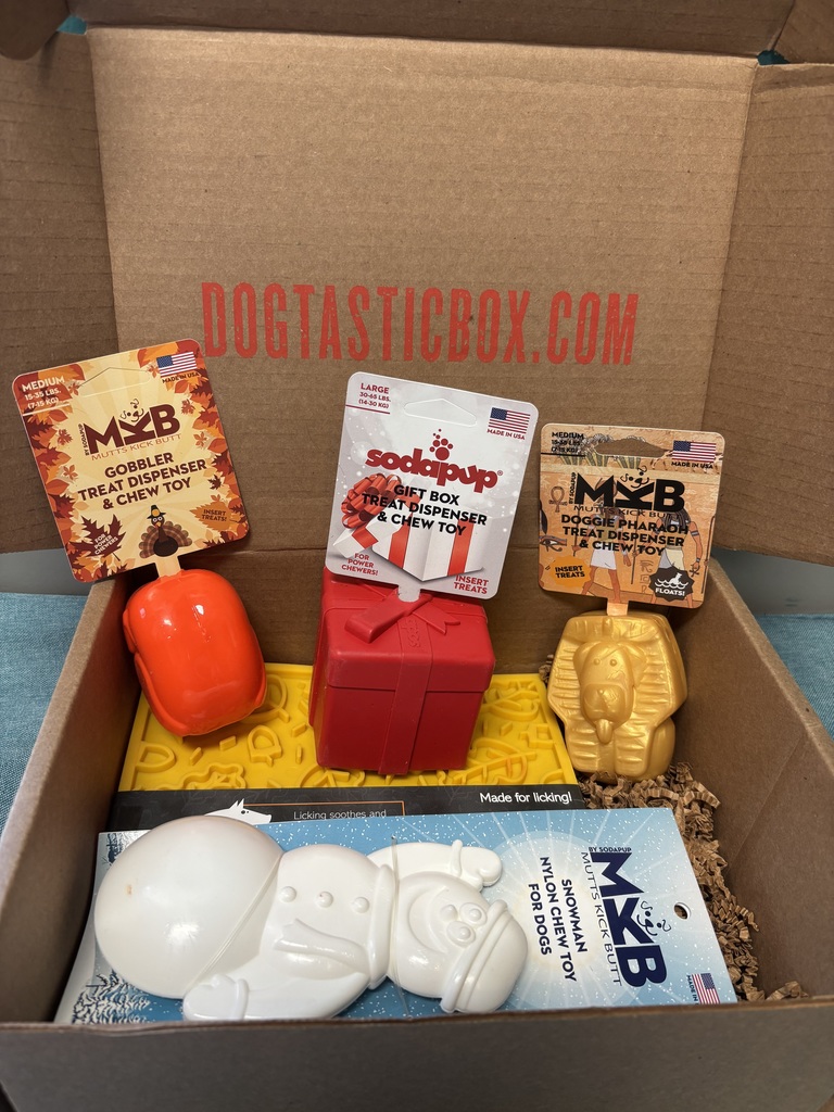 You are bidding on a Dogtastic Box of goodies from sodapup. The box includes: