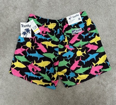 This item is BLACK (with multicolored Sharks) - in Size "ADULT MEDIUM".  It's a NEW "Trunks Surf and Swim Company" brand Bathing Suit / Swim Trunks.  Quick-dry technology, mesh lining, rear pocket with adhesive velcro to keep closed.  Available for nationwide bidding.  Item can be shipped to Winning Bidder or picked up for FREE in Enfield, CT after the Auction.  Fun style, great fit!