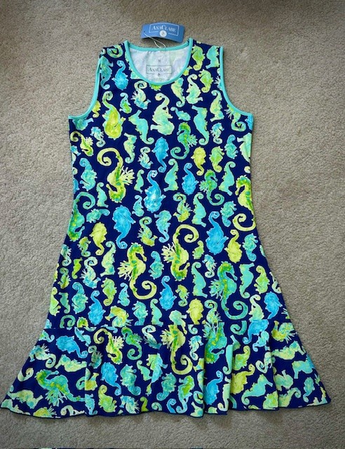 Seahorses: Elegant, stylish, and fun!  (New with tags, $78 Value - see it on the "AnaClare Active" Website, too.)  Classic style: flowing lines and graceful flouce move with every step.  AnaClare is known for their easy-care apparel, with designs to empower and inspire women.  So comfortable: wear for Dinner, Brunch, Golf, Beach, or Parties.  This is their most popular "Floucy Dress" in the sold-out "Neptune Pattern".  Dress is SIZE MEDIUM.  (Equivalent to Women's Size 8 to 10, length falls just "above the knee").  Our Auction also has matching SEAHORSE Capri Pants in the same pretty Navy Blue/Blue/Lime Pattern - as well as other top-rated beautiful Shirts with Turtles and Coral by "Ana Clare Active".)  Stylish and comfortable, can wear year round.  95% Cotton, 5% Spandex.  Machine washable.  Item can be shipped nationwide to Winning Bidder - or picked up for FREE in Enfield, Connecticut.  Buy now and save for the Holidays!
