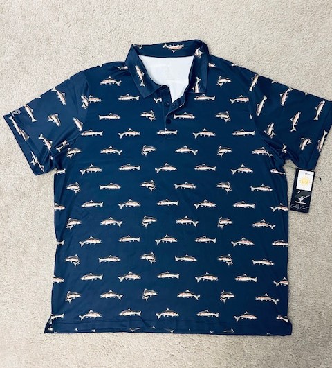 Best Gift: Fun FISH Pattern - in a classy shirt!  (Plus, it's a "SUN-SHIRT" with UPF-50 Protection.  Brand new with tags.  This is size "Adult, MEDIUM".  Moisture-wicking, 4-way stretch, breathable fabric.  (Note: There are additional similar shirts in this Auction, under the "Fitness", "Travel", and "Clothing" Categories - and you can get the same style in different sizes - to have MATCHING SHIRTS, with family and friends!)   This shirt is Navy Blue, Comfort-stretch, Short sleeve - in a 3-button "Collared Style" - perfect for Beach, Boat, Summer Nights, or Golf Course.  Lightweight, with a fun Fish Pattern.  Loose fit: 95% Polyester, 5% Spandex.  Item can be shipped nationwide to Winning Bidder (with insurance) or picked up for FREE in Enfield, CT after the Auction.  Stylish, unique, and fun!