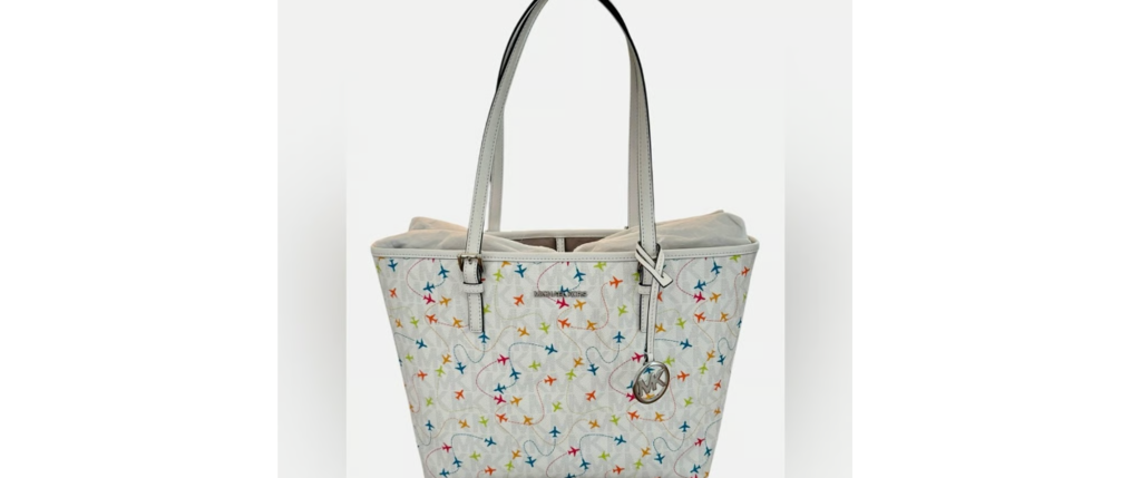 Elevate your style with this beautiful Michael Kors Jet Set Medium Tote Bag with a unique White Multi-color Airplane print! Perfect for travel enthusiasts and fashion lovers alike, this tote combines functionality with a playful design. Travel in style with this fun and colorful MK tote! Bid Bid Bid!