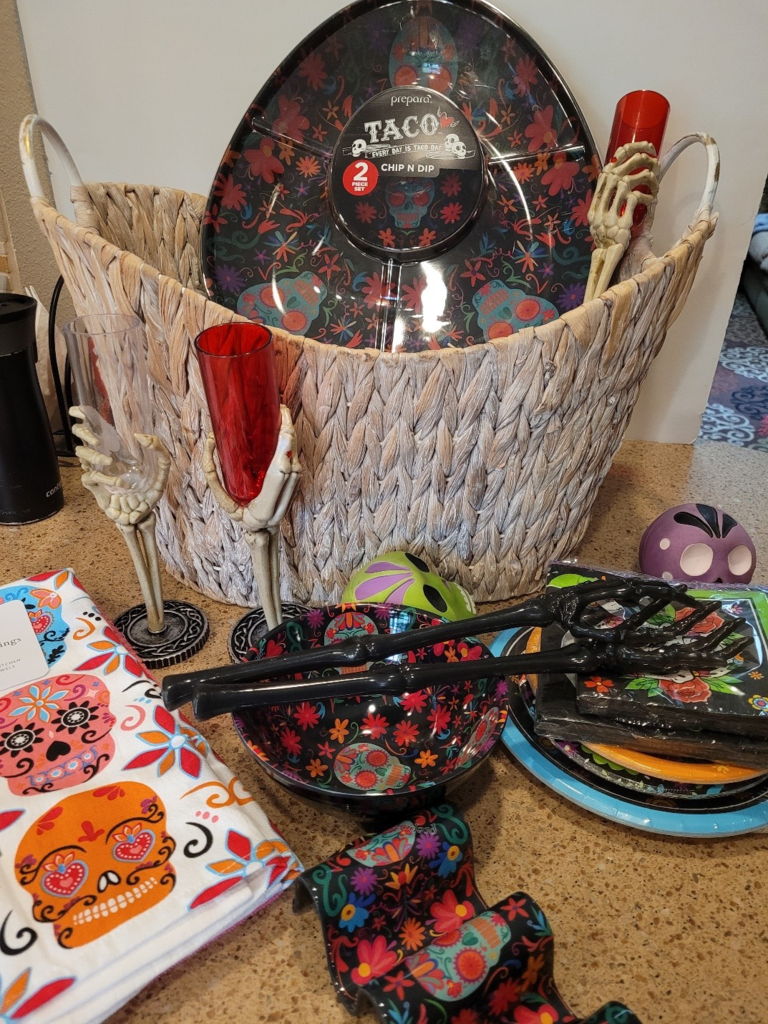 Basket, Taco Chip and Dip tray, Guacamole Bowl, Taco Holder, 2 Kitchen Towels, 3 Goblets, Salad Tongs, 16 ? 6? paper plates, 8 ? 8.34? paper plates, 32 ? paper napkins (cocktail and dinner), 2 - Squeaky Toys for Dogs, $100. Raley?s Gift Card.