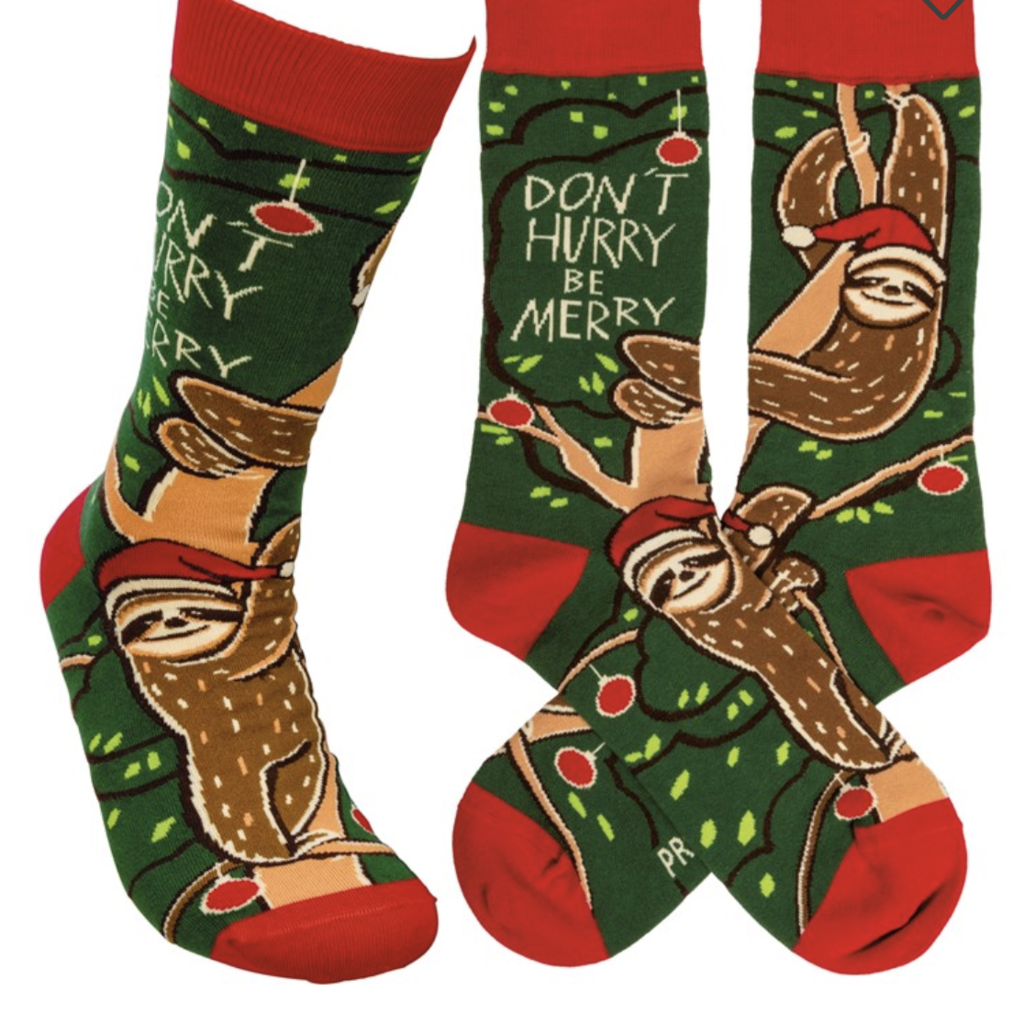 These colorful socks feature woven designs with coordinating "Don't Hurry Be Merry" sentiment. Cotton, nylon, spandex. One size fits most.