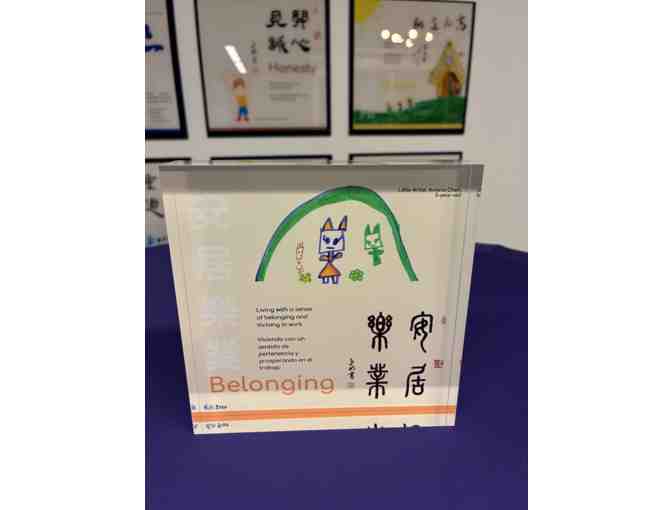 Belonging is a bright and joyful creation by five-year-old Aviano Chen. It beautifully combines the elegance of Chinese calligraphy with the innocence of children’s art, weaving together tradition and imagination. The inscription reads: “Living with a sense of belonging and thriving in work,” also translated in English and Spanish, underscoring the universal importance of feeling connected, supported, and valued.