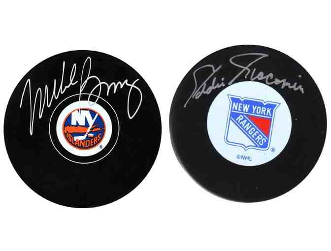 The winning bidder selects the hand signed, Official NHL Hockey Puck from the legend of their choice: Mike Bossy or Eddie Giacomin.