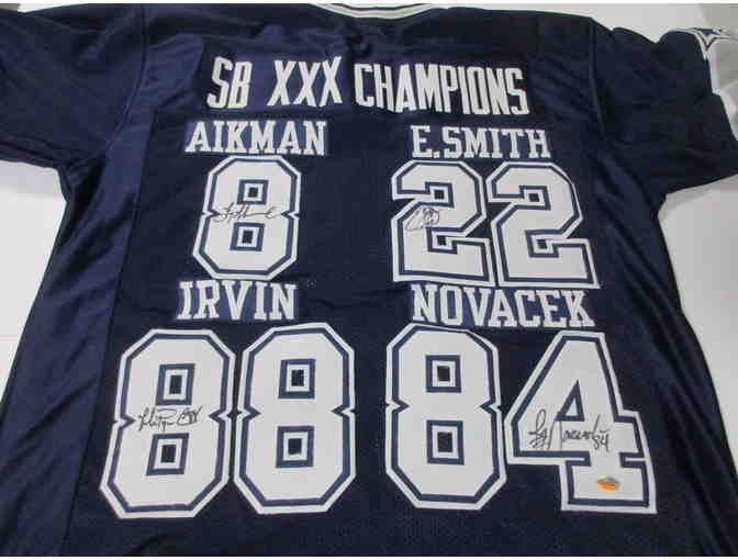 Super Bowl XXX Autographed Football Jersey with Troy Aikman, Emmitt Smith, Michael Irvin and Jay Novacek. Comes with certificate of authenticity.