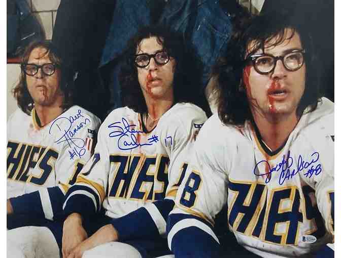 Dave Hanson, Jeff Carlson , & Steve Carlson Slap Shot Large Autographed Photo. Comes with certificate of authenticity.