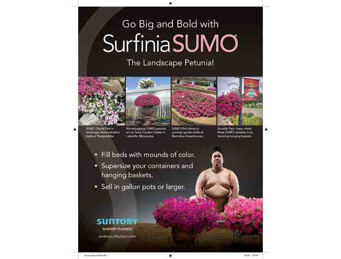 Suntory Flowers is an innovative breeding company based in Japan known for varieties that offer outstanding weather tolerance. Surfinia Sumo petunias are used in community beautification programs. Suntory offers a unique auction package to our AIB communities. You can order 4 trays of Surfinia petunia plugs (a total of 200 plants).