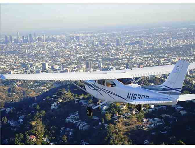 The one-hour flight will go from the Santa Monica Airport to the beach and then follows the coastline to Pacific Palisades and Malibu. The plane will then turn back and follow the Santa Monica Mountains to Hollywood and across the Hollywood Hills for a pass over Universal Studios. You'll fly by the Hollywood Sign, then over Hollywood to Downtown LA. You'll make two circles around downtown before heading back to Hollywood and over Century City before landing back in Santa Monica.