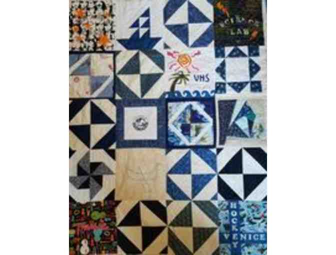 This a one of a kind, handcrafted quilt. It was created for this special event to raise funds for the arts at Venice High. Each square was made with love by members of the Quilts for the Heart local chapter. Note the dominate blue and white color scheme with a variety of special blocks which depict Venice High in various ways.
