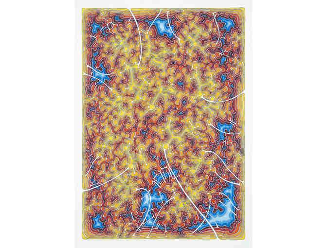 "Contained Conundrum", 2022 ink and acrylic on paper 13.5 x 11 in. Framed The drawings of Daniel Zeller have biomorphic, cartographic and psychic perspectives of planetary or cellular bodies. He draws in a meditation mode of consciousness. Daniel Zeller drawings have similarities to many things: a satellite view of a distant country, a microscopic vision of an organic mass or a briefly retained image after a recent dream. His compositions twist and vibrate, persuading the viewer to come closer and closer. What seems two-dimensional translations of a three-dimensional world is a constant game between -formal or natural- abstraction and representation. His technique requires a meticulous and obsessive repetition as well as a series of spontaneous decisions governed by self-imposed rules and conditions. This tension (or perhaps contradiction) between spontaneity and predictability is central in his creative process. Zeller 's work is represented in the permanent collections of the MoMA - Museum of Modern Art (New York), Whitney Museum of American Art (New York), Albright -Knox Art Gallery (Buffalo, NY), Los Angeles County Museum of Art (LA, CA), among others.