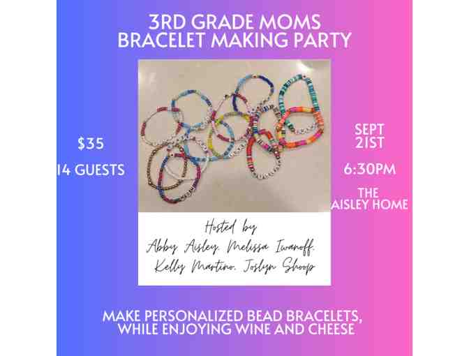 Make personalized Bead Bracelets, including glass and heishi beads, while enjoying wine and cheese with fellow 3rd Grade Willow Moms. A fun night out with friends and a way to meet new ones! No craftiness needed!