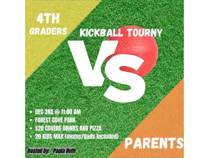 4th Graders - come join us for kickball fun at Forest Cove park! Ticket price covers drinks & pizza.**Tickets only need to be purchased for the kids - moms/dads are included with ticket purchase**
