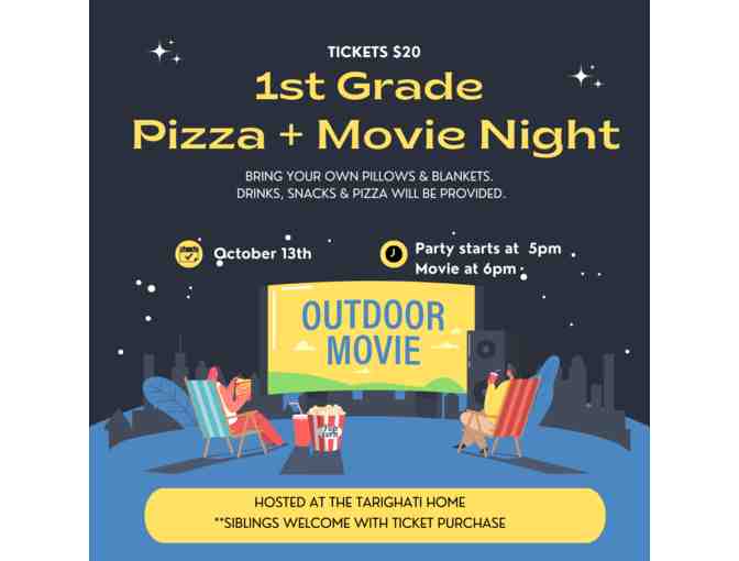 1st Graders - Join us for an outdoor movie night complete with pizza, drinks & snacks. Party starts at 5pm & movie at 6pm. Bring your own pillows & blankets. Siblings welcome with ticket purchase.