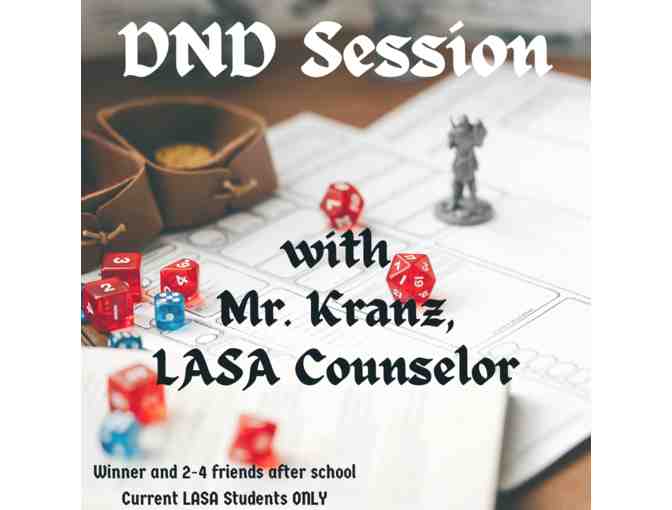Adam Kranz (LASA Academic Counselor Jo-Mo) will run a DND session for any LASA student and 2-4 of their LASA friends after school in the LASA library (assuming access can be secured)