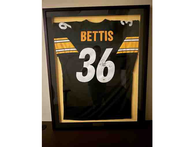 The signed, framed #36 Jerome Bettis jersey is donated by Bruce Weiner.
