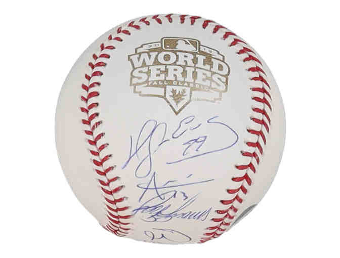 Official 2012 World Series baseball. Hand-signed by Madison Bumgarner, Pablo Sandoval, Joaquin Arias, Bruce Bochy, Jose Mijares, Hector Sanchez and Ryan Vogelsong