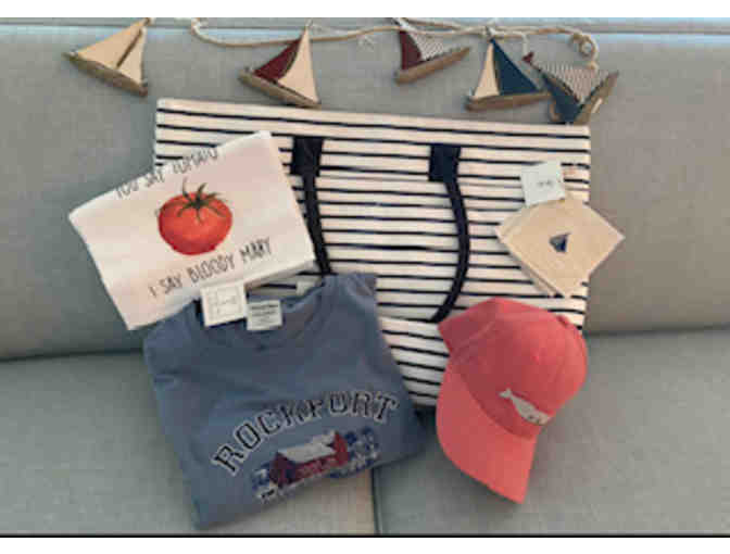 Local Downtown Rockport men's clothing store gift bag. Includes: Tshirt, Hat, Dish towel, Beach tote and Sailboat garland!