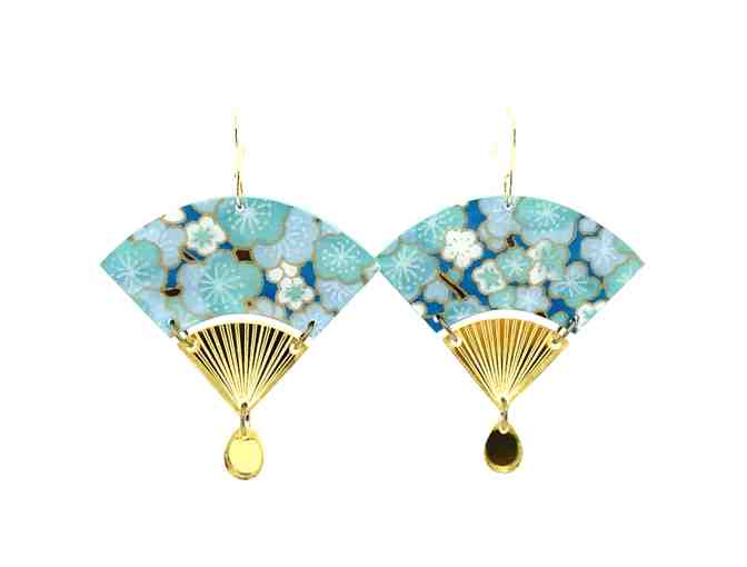 Japanese sakura paper on teal acrylic, gold mirror acrylic accents. Hypo-allergenic stainless steel gold-colored hooks.
