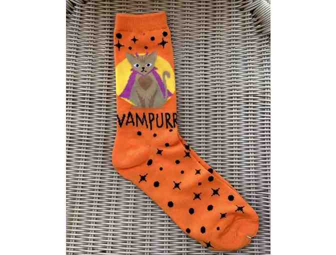 Fun spooky socks for the cat lover! 97 percent polyester, 3 percent spandex. Shoe size 4-10.
