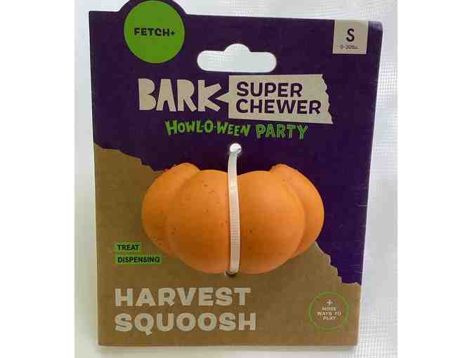 Bark Super Chewer Howl-o-ween party. Natural rubber fillable toy provides a mentally-stimulating challenge to keep dogs busy. Made of natural rubber and is safe and durable for most moderate chewers. Fill the opening with your dog's favorites and let them work for it. Filling ideas: treats, kibble, wet food, peanut butter. Dishwasher safe.
