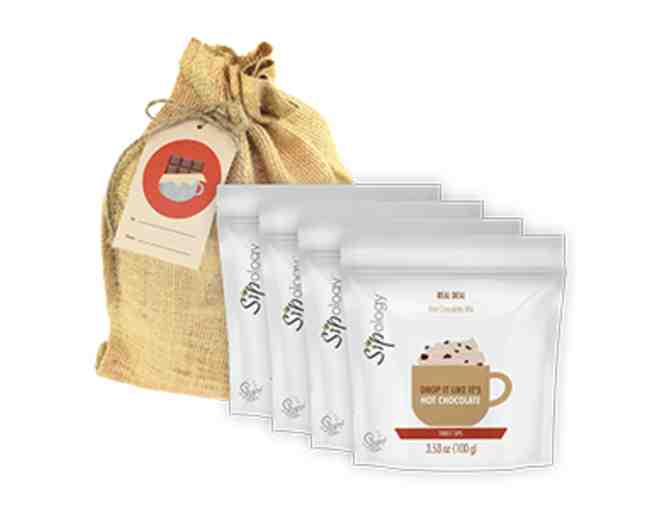 Sipology's delicious, creamy Hot Chocolates have only 5 g of sugar per serving with no artificial colors, flavors or milk ingredients. Includes: 3.53 oz (100 g) each of Real Deal Hot Chocolate, Peppermint Hot Chocolate, Salted Caramel Hot Chocolate, Amaretto Hot Chocolate plus FREE Burlap Bag with gift tag.