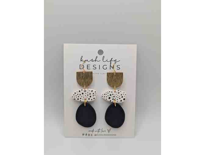 Generously donated by Joy Kushner, d/b/a Kush Life Designs, these beautiful polymar clay and metal gold, black, and white earrings are light, classy, and beautiful! Each of these earrings are unique and hand crafted.