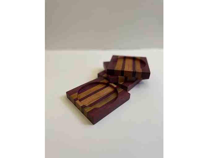 Set of four wood coasters made with purple heart, cherry and oak wood.