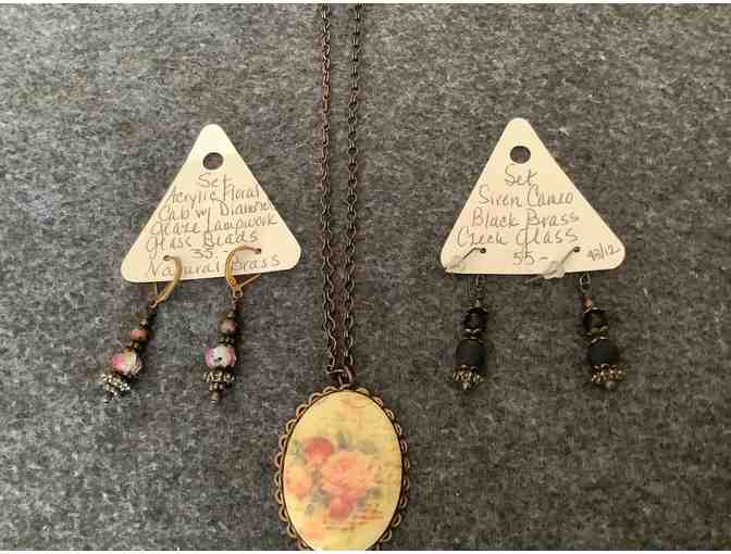 Handcrafted by a Marine Veteran, 2 sets of Earrings, marked $35.00 and $55.00, no price on necklace.