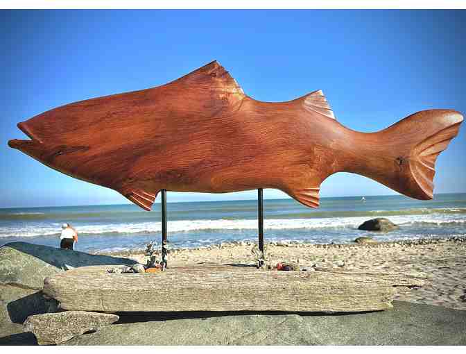 Radio Farm Red | Old growth redwood, hand carved and sanded, on a driftwood fence post base, retrieved from Squibnocket beach. Interactive sand pockets decorated with moveable ocean artifacts.
