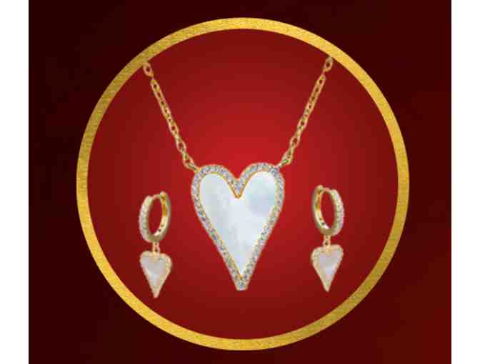 Celebrate the Spirit of Love! Alluring genuine mother of pearl heart necklace and earring set provides an instant glow. The perfect addition to any outfit, be it casual or dressy, for all seasons. Timeless and contemporary. A loving treasure is a meaningful gift. Made with fine diamond stimulates. Set in .925 Sterling Silver, 14k gold overlay. Adjustable chain.