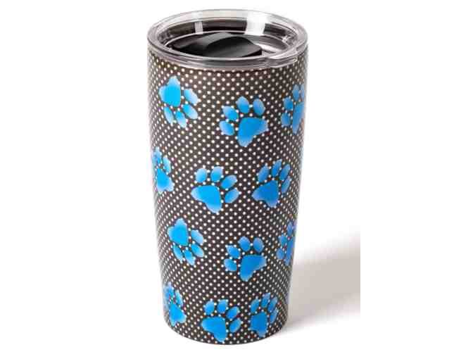 Enjoy your coffee or tea in this Polka Dotted, Ombre Paw printed travel mug. It has a clear vacuum seal lid with a slide closure to keep your drinks hot or cold.
