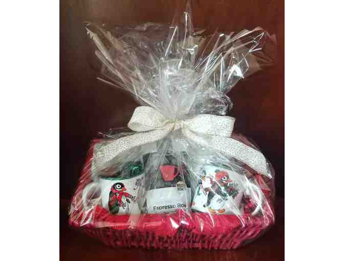This Gift Basket includes: Two holiday mugs featuring cute penquins. Each mug is filled with individually wrapped chocolates. Also included is a bag of Espresso Roast (Whole Coffee Beans.) All this is nestled in a festive red basket which has been lined with 2 red cloth napkins.