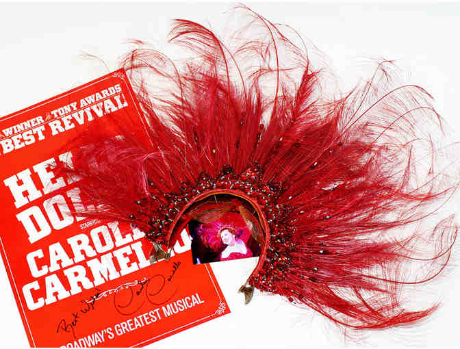 An iconic red feather headpiece that Carmello wore in her performance as Dolly Levi in the national tour of Hello, Dolly! A photo of her wearing the headpiece (perhaps It could be framed with the headpiece in a shadow box and add the photo as part of the display). Plus, a windowcard from the Hello Dolly! national tour thats been autographed by Carmello.