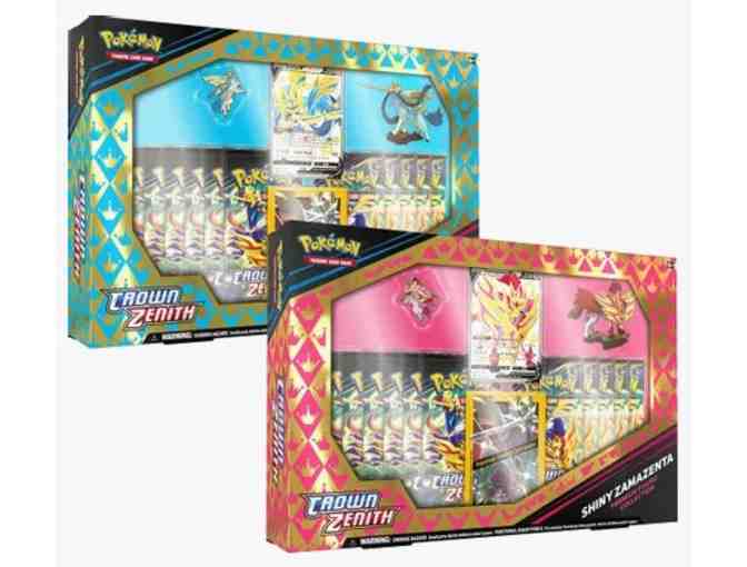 Shiny Legendary Pokémon are among the most sought-after Pokémon of all, and now you can add Zacian or Zamazenta to your collection as a Shiny Pokémon V! In addition to an etched foil promo card, the star Pokémon also appears as a detailed figure and glossy enamel pin, and both Zacian and Zamazenta appear together on a full set of illustrated card sleeves. You’ll even find a stack of booster packs from the Crown Zenith expansion to grow your collection even more!