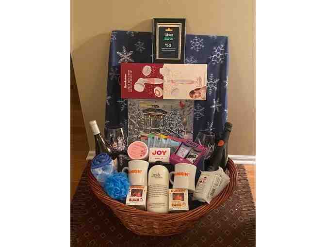 Hunker down with Wine,hot chocolate bombs, bath/body items,fleece blanket, a puzzle and Uber Eats Card valued at $50