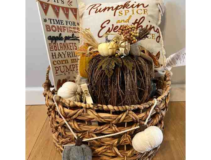 Decorative basket filled with pumpkin decoration, pumpkin garland, a fall sign and pillow.