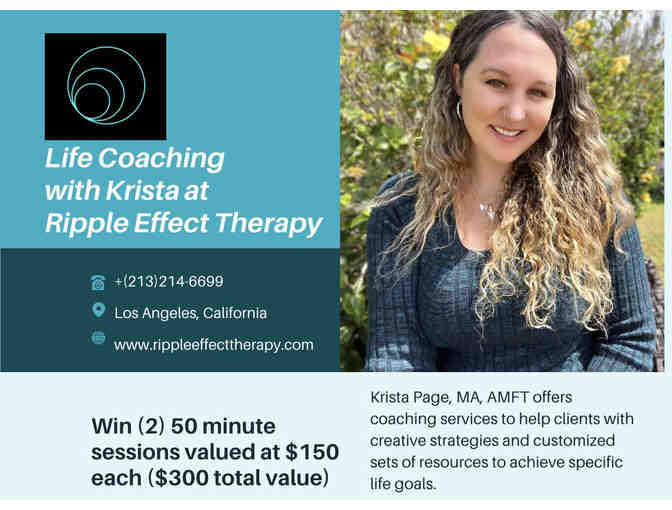 Bid on 2 50-minute sessions of life coaching with Krista Page MA, AMFT. Life coaching is a useful tool that can help you in areas of life transitions, nurturing relationships, maintaining health, finding enjoyment, seeking career guidance and overall success in life. Sessions are offered on Zoom or in the local Los Angeles area.