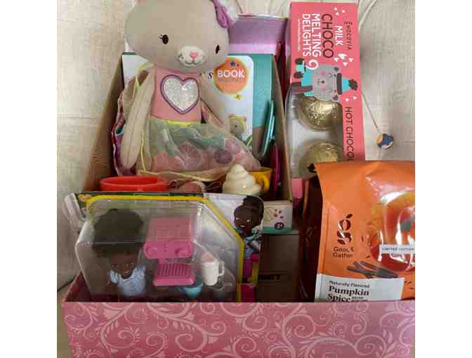 Basket includes Good & Gather coffee, Set of two Lecrueset heart mugs and saucers, Cali cat's tea party, toy tea party set, plush cat toy, Barbie "Chelsea can be" barista set, hot chocolate bombs