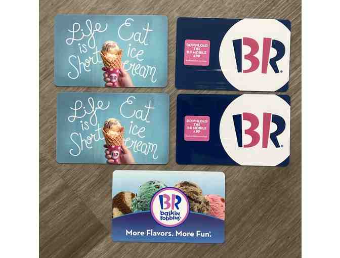 A variety of Baskin Robbins gift cards for indulging in delicious ice cream treats. 5 giftcards, each worth $5.