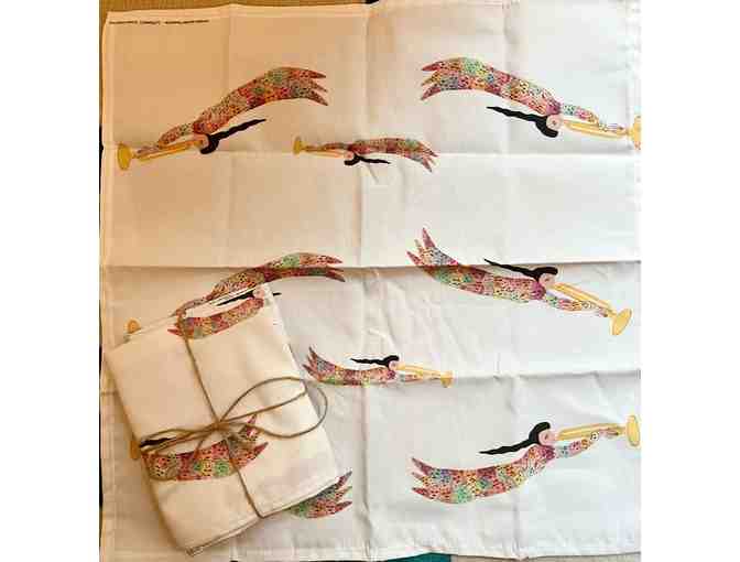 Four new cotton dinner napkins with colorful Howard Finster trumpet angel images, approx 20"x20".