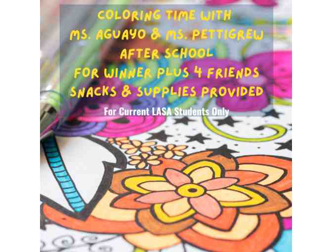 Winner plus four friends will meet for an hour after school to color. Prior to the event, donors will contact the winners for theme ideas. Snacks and coloring items will be provided.