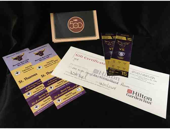 Looking for a fun night of NCAA Division I hockey? And better yet, the ability to combine that with a hotel stay and meal in downtown Mankato? This package is for you. Two Blue Line Club seats at center ice (section 203, row D, seats 13 and 14) versus St. Thomas on Saturday, February 3, 2024, one room next door at the Hilton Garden Inn, and a $30 gift card at "Pub 500."